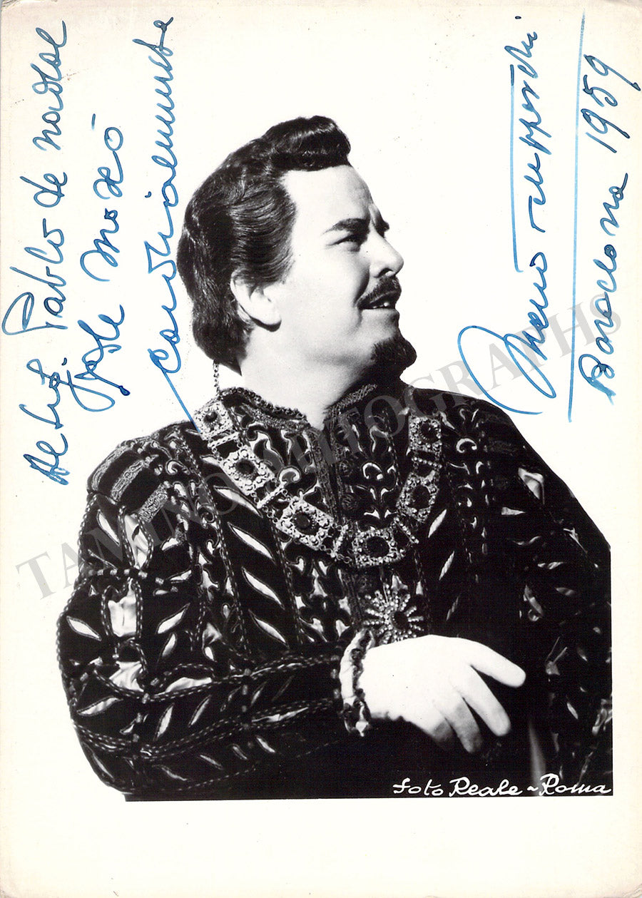 Italian tenor (1907-1979), signed photograph, shown in role, inscribed and signed in Bologna, dated in 1959. Photo by Foto Reale photographers, Rome. Size is 5.1 x 7.2 inches, small creases on edges, otherwise in excellent condition.