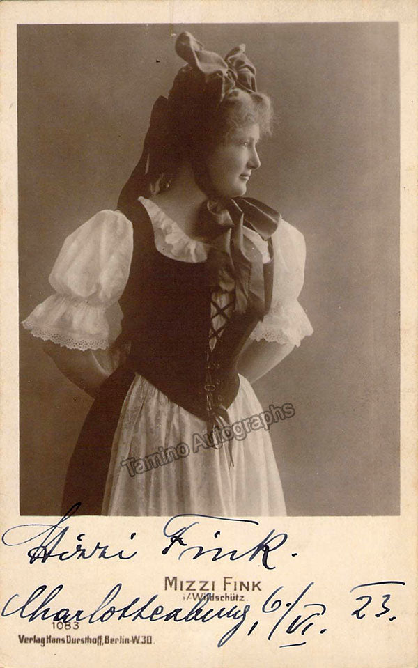 Austrian Soprano (1882-?), signed postcard photograph, shown in role in Albert Lortzing's opera Der Wildschütz, dated in Berlin in 1923. Photo by Hans Dursthoff photographers, Berlin. Size is 3.25 x 5.25 inches, some rust on verso, otherwise in excellent condition.