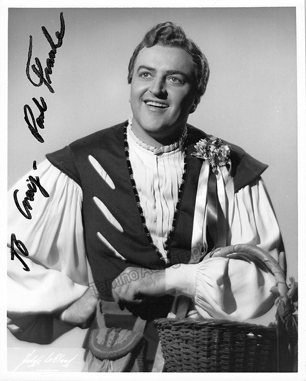 American comprimario tenor (1917-2011),  had a very long association with the Metropolitan Opera where he performed nearly 2000 times from 1948 to 1987. Signed photograph, shown in role, inscribed. Stamped on verso by photographer Sedge LeBlang, New York. Size is 8 x 10 inches, in excellent condition.