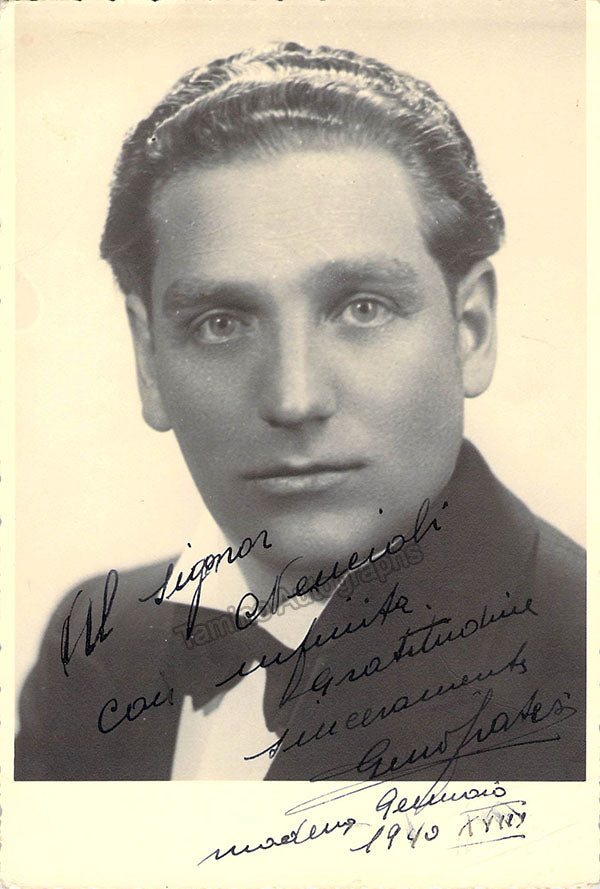 Italian tenor (1906-1993), signed photograph, shown as himself. Inscribed and dated in 1940. Blind stamped on front by photographer. Size is 4.5 x 6.75 inches, in excellent condition.