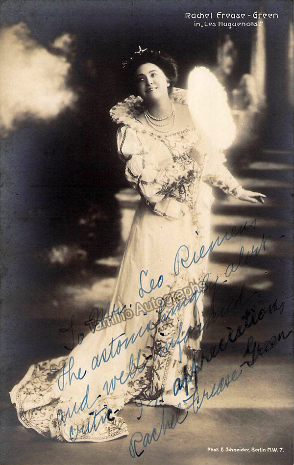 American soprano whose birth name was Rachel Belden Frease (1875-1953). Signed postcard photograph, shown in role in Meyerbeer's Les Huguenots, inscribed with a short sentiment. Photo by E. Schneider, Berlin. Size is 3.5 x 5.5 inches, very slight silvering on some edges, otherwise in excellent condition.
