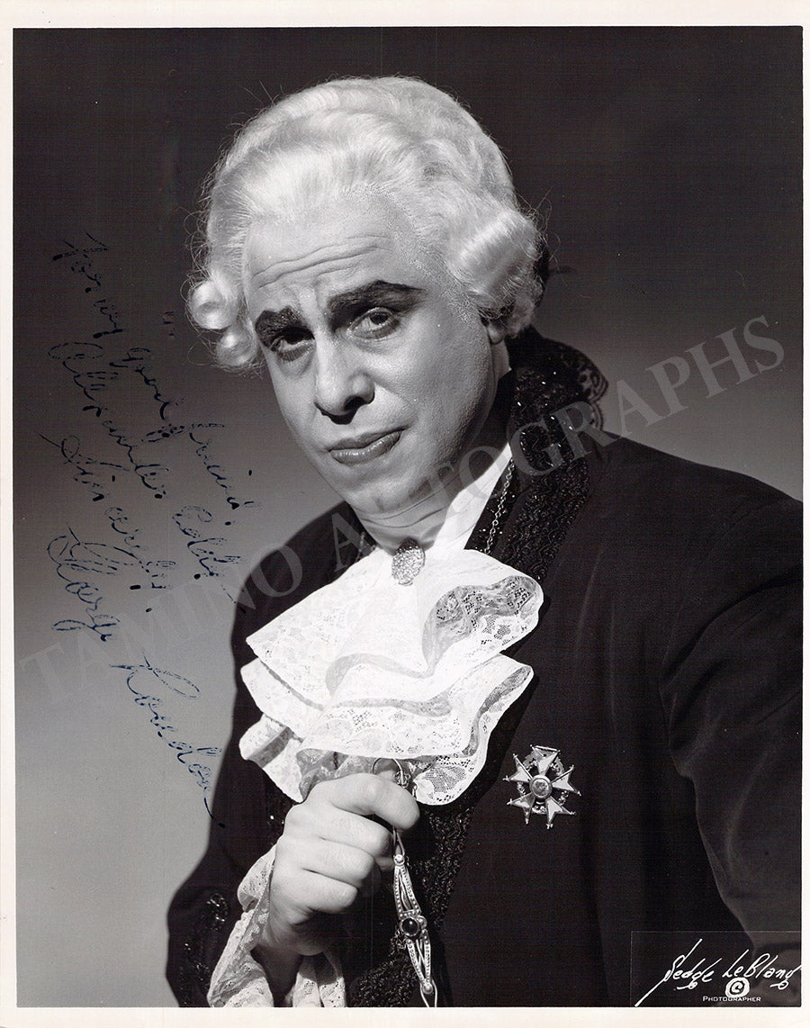 Fine black-and-white photograph signed and inscribed by him with a short sentiment, depicted as Vitellio Scarpia in Puccini's opera Tosca; ink-stamped on verso by photographer Sedge LeBlang (New York). Size is 7.8 x 9.8 inches, in excellent condition.