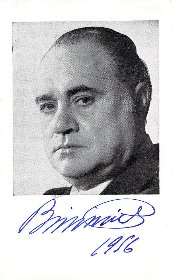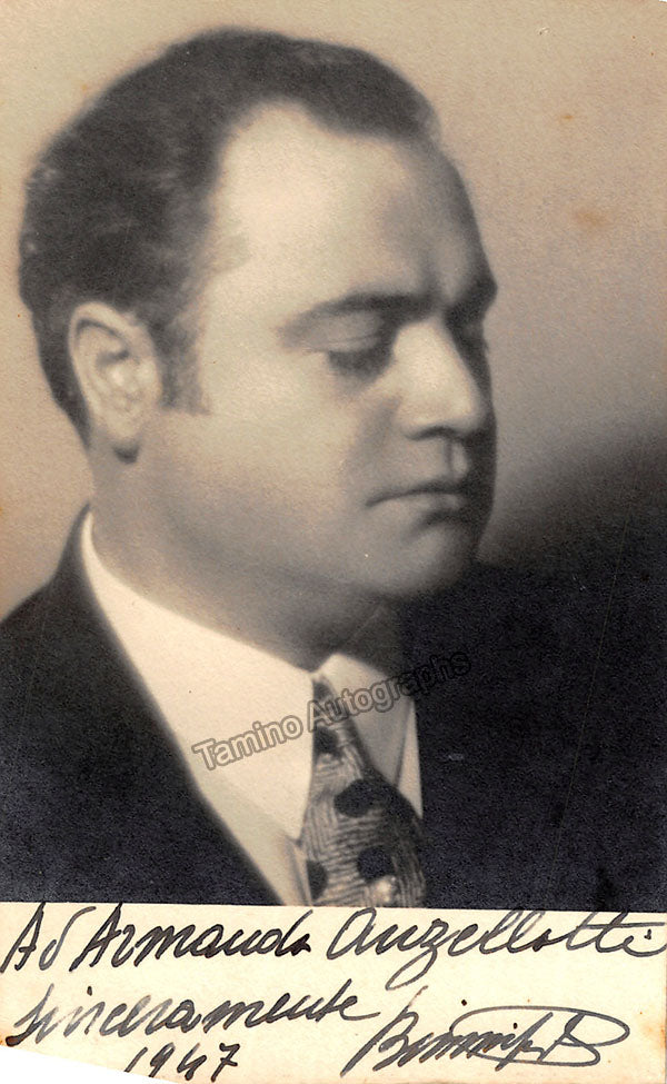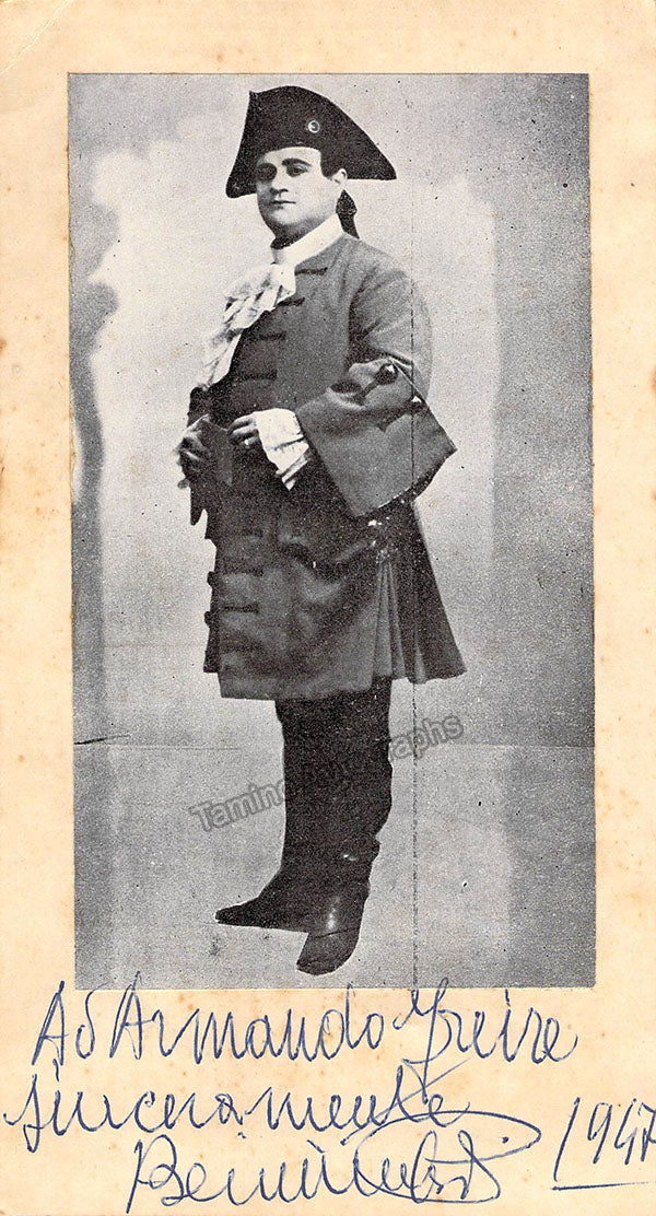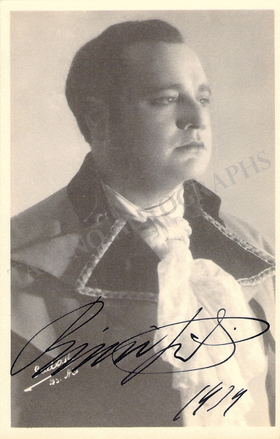 Signed black-and-white postcard photograph, dated in 1934, shown probably in the title role of Giordano's Andrea Chénier at Teatro Colon, Buenos Aires.Ink-stamped on verso by photographer L. Sudak. Size is 3.4 x 5.4 inches, in excellent condition.