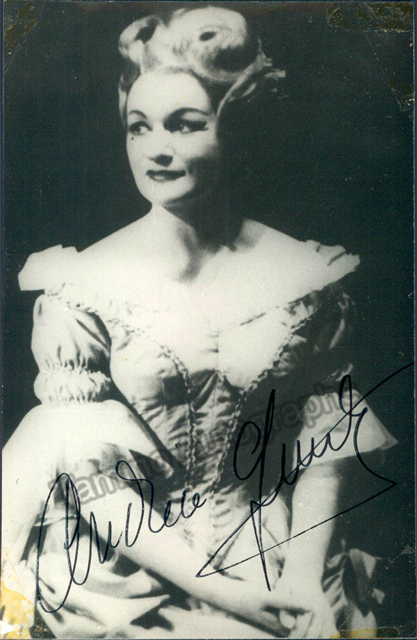 French soprano (b.1928), signed photo, shown in role, with some tape residues on the corner, otherwise in very good condition. Size is 3.25 x 5.25 inches.