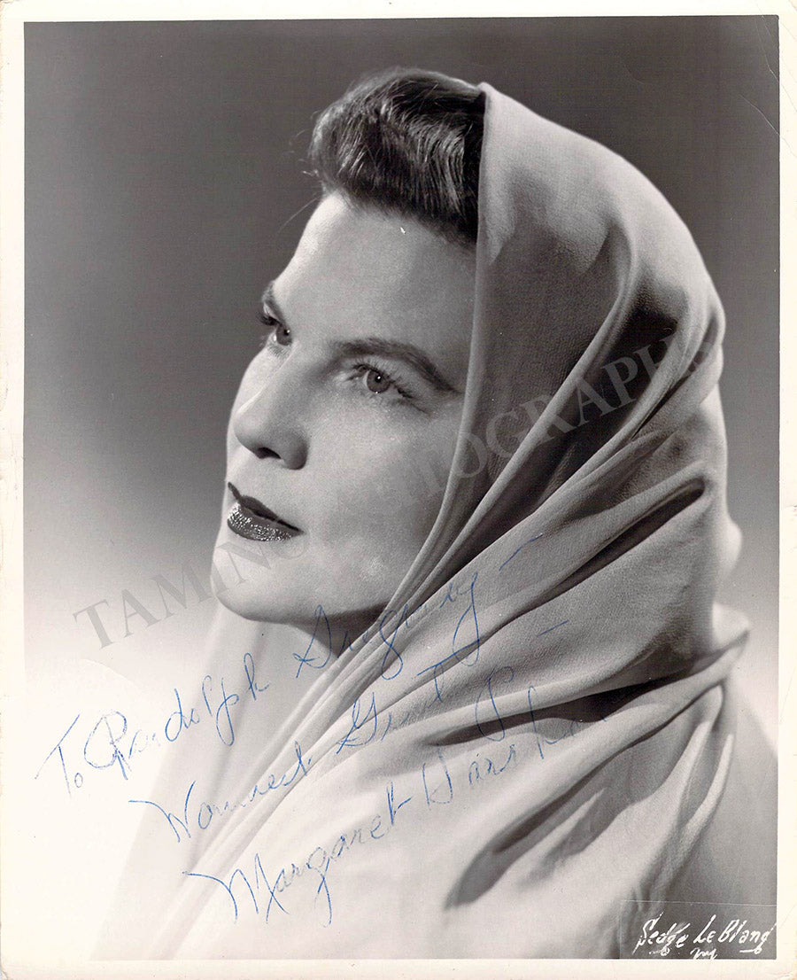 Signed photograph, shown in role, inscribed. Stamped on verso by photographer Sedge Le Blang, Metropolitan Opera, New York. Attractive photo with clear signature. Size is 8 x 10 inches, several creases and bends, otherwise in very good condition.