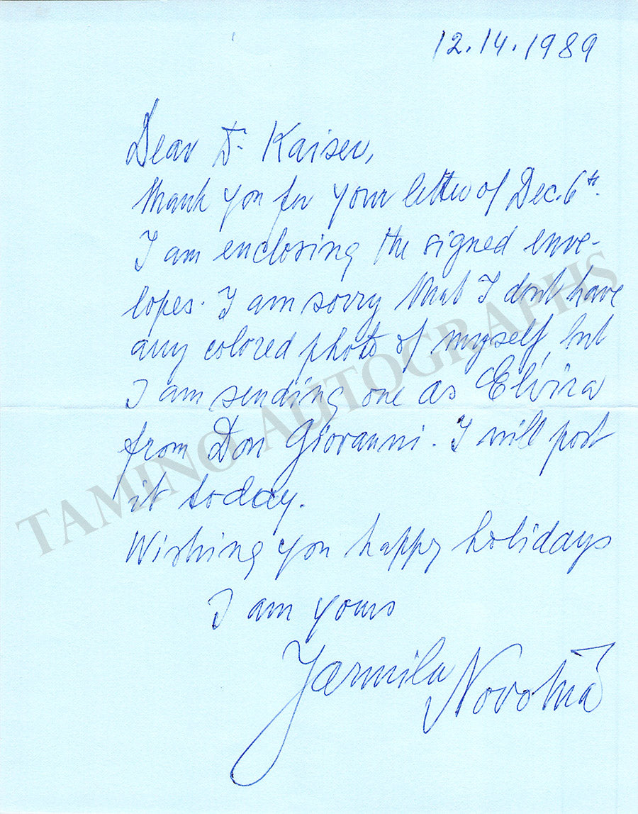 Nice autograph letter signed by her, dated December 14, 1989, replying to a fan and sending some photographs and envelopes. Size is 6.4 x 8.2 inches, folds, in excellent condition.