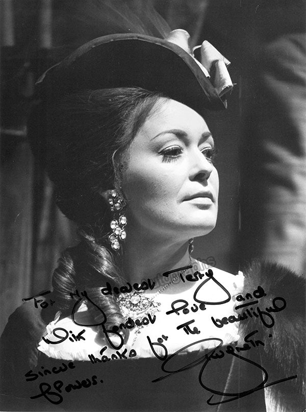 Gorgeous black-and-white photograph signed by her, shown on stage as Salomé in the famous Strauss' opera; ink-stamped on verso by photographer Erio Piccagliani, Teatro Alla Scala, season 1973-1974. Size is 4.1 x 5.75 inches, light stain on the verso, otherwise in excellent condition.
