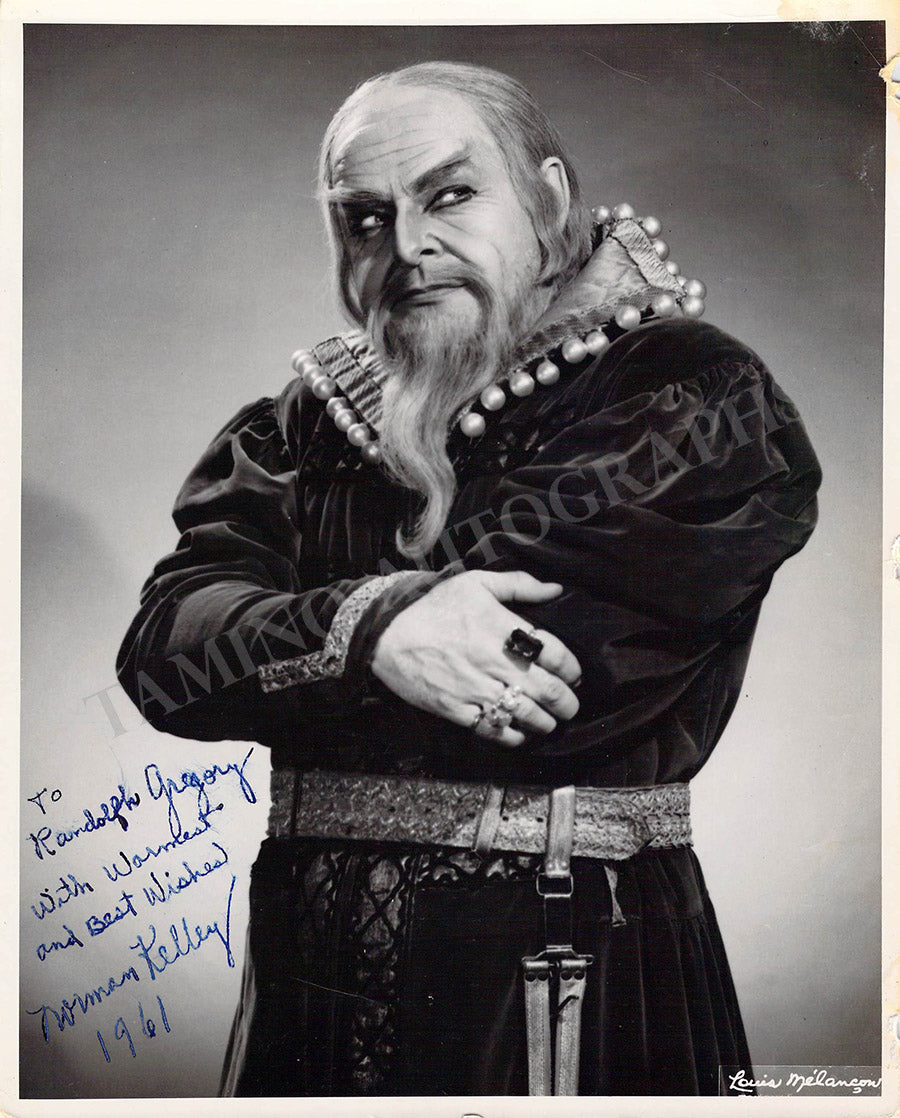 American tenor (1911-2006), signed photograph, shown as Prince Shuisky in Mussorgsky's Boris Godunov, dated in 1961. Stamped on verso by photographer Louis Melancon, Metropolitan Opera, New York. Size is 8 x 10 inches, with several creases and bends as well as small bullet holes on the right, otherwise in good condition.