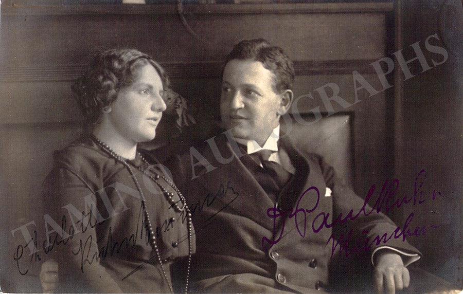 German tenor (1874-1966) and his wife, German soprano (1878-1958).  Set of 2 double signed postcard photographs,  shown as themselves as a couple, one of which is heavily inscribed on verso.  Size of each is 3.5 x 5.5 inches, some small creases, otherwise in excellent condition. Not sold separately