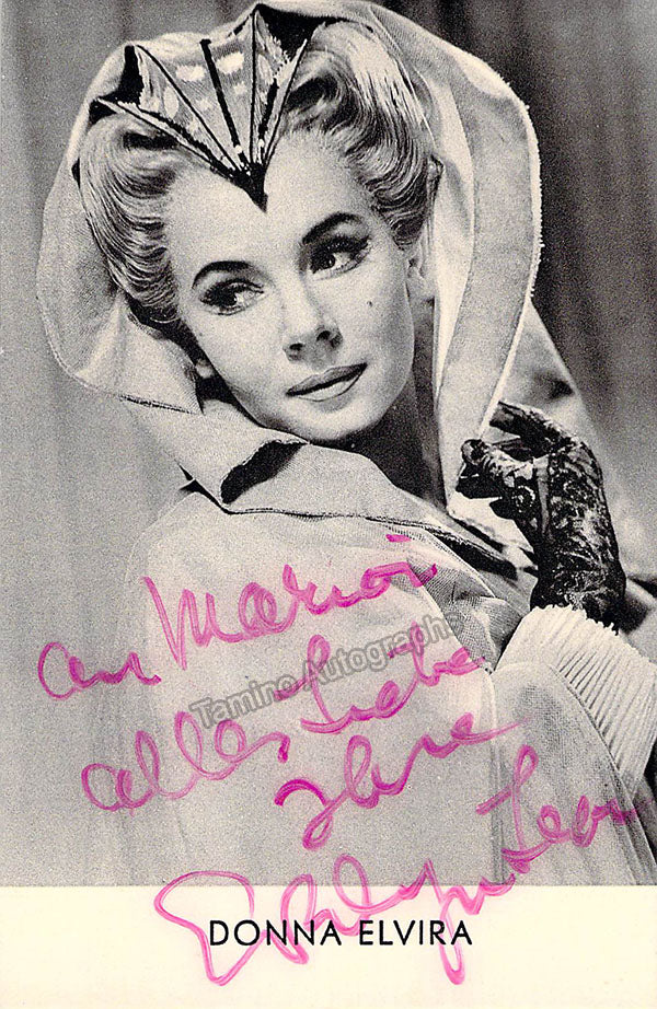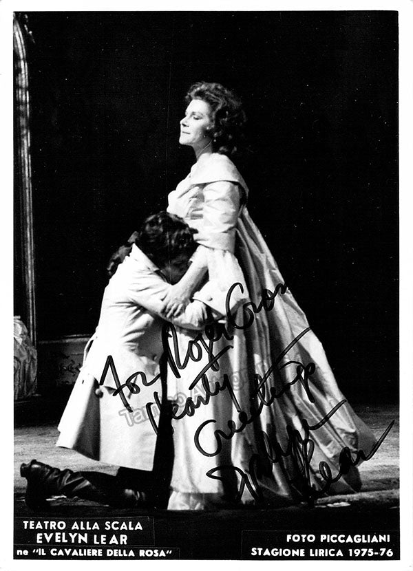 Signed photograph, shown as the Marschallin in Richard Strauss's Der Rosenkavalier, inscribed. Stamped on verso by photographer Piccagliani, La Scala, Milan. Size is 4 x 5.75 inches, very small crease on bottom right, otherwise in excellent condition.