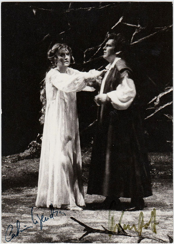 Swedish soprano (b. 1937) and Bulgarian tenor (1928-2013), known for Wagnerian repertoire, double signed photograph, shown in roles. Stamped on verso by photographer Jurgen Kranich, Berlin. Size is 4 x 5.75 inches, in excellent condition.