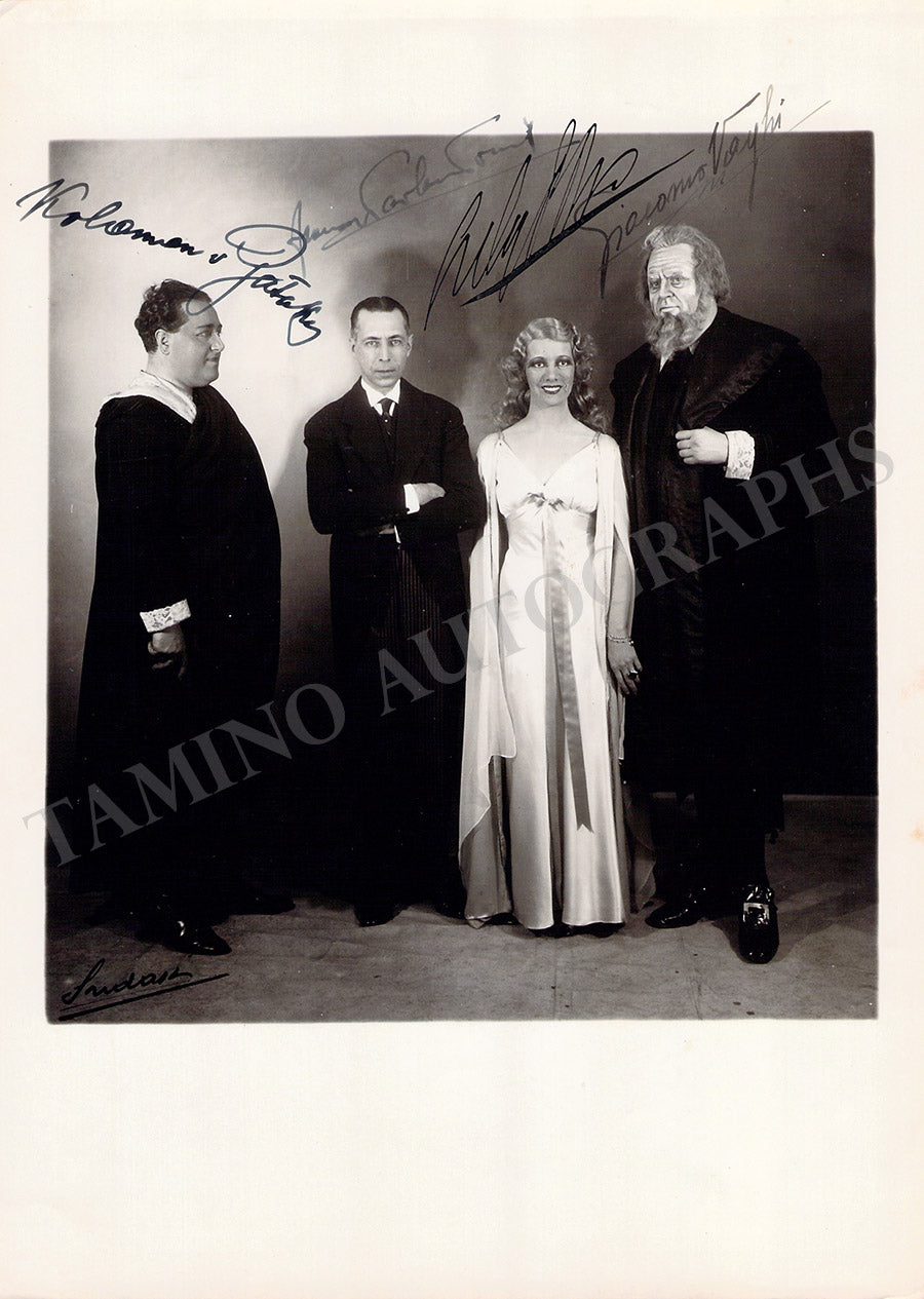 Gorgeous black-and-white photograph by photographer Sudak, signed by Lily Pons, Giacomo Vaghi, Paolantonio Franco, and Koloman von Pataky, shown backstage during the performances of Donizetti's Lucia di Lammermoor at Teatro Colon, Buenos Aires, 1934.