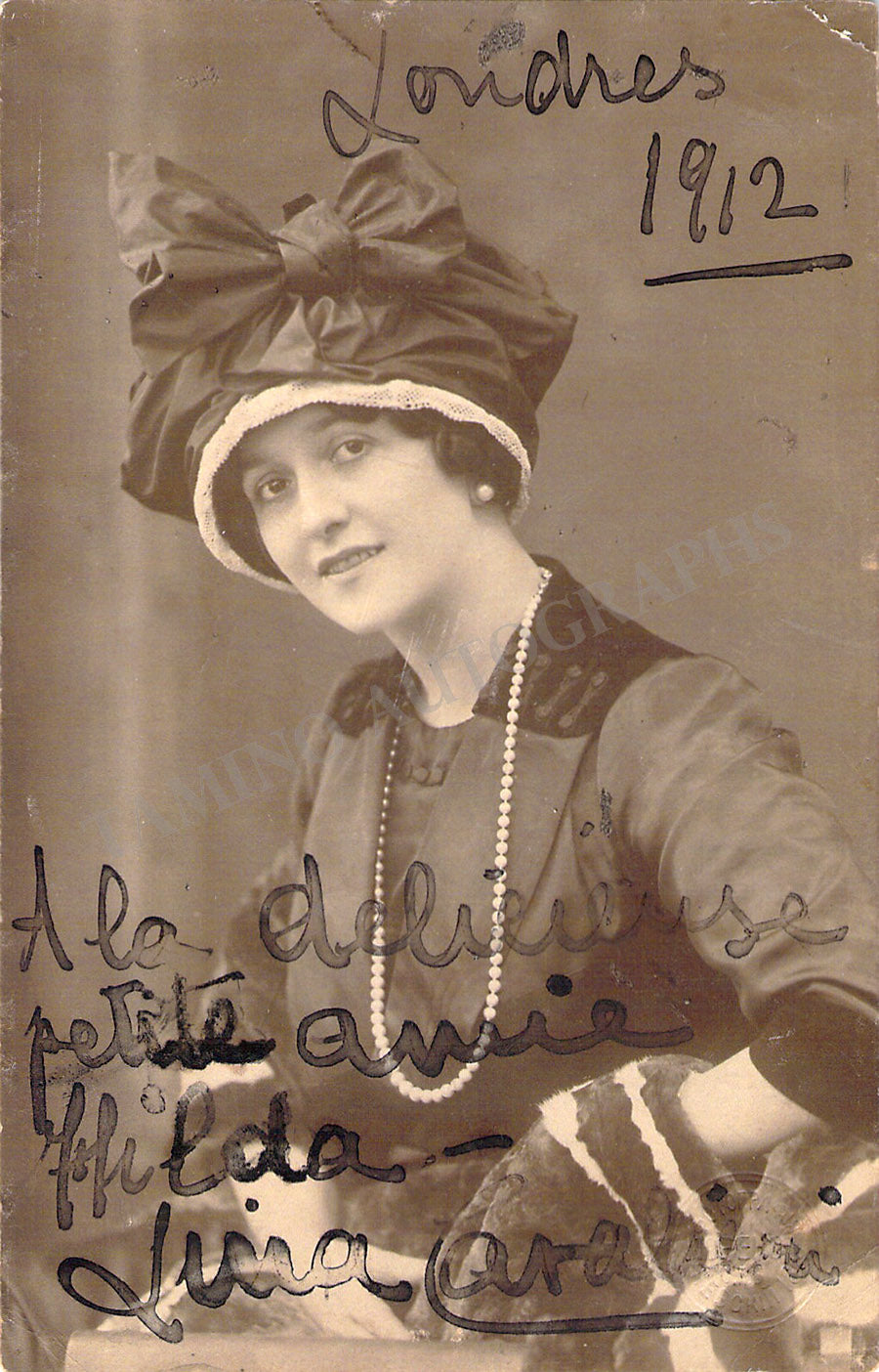 Beautiful black-and-white photo postcard shown as herself, signed and inscribed by her, dated in London, 1912. Size is 3.4 x 5.3 inches, small crease over the top-right corner,  small repaired crack at the top center, otherwise in very good condition.