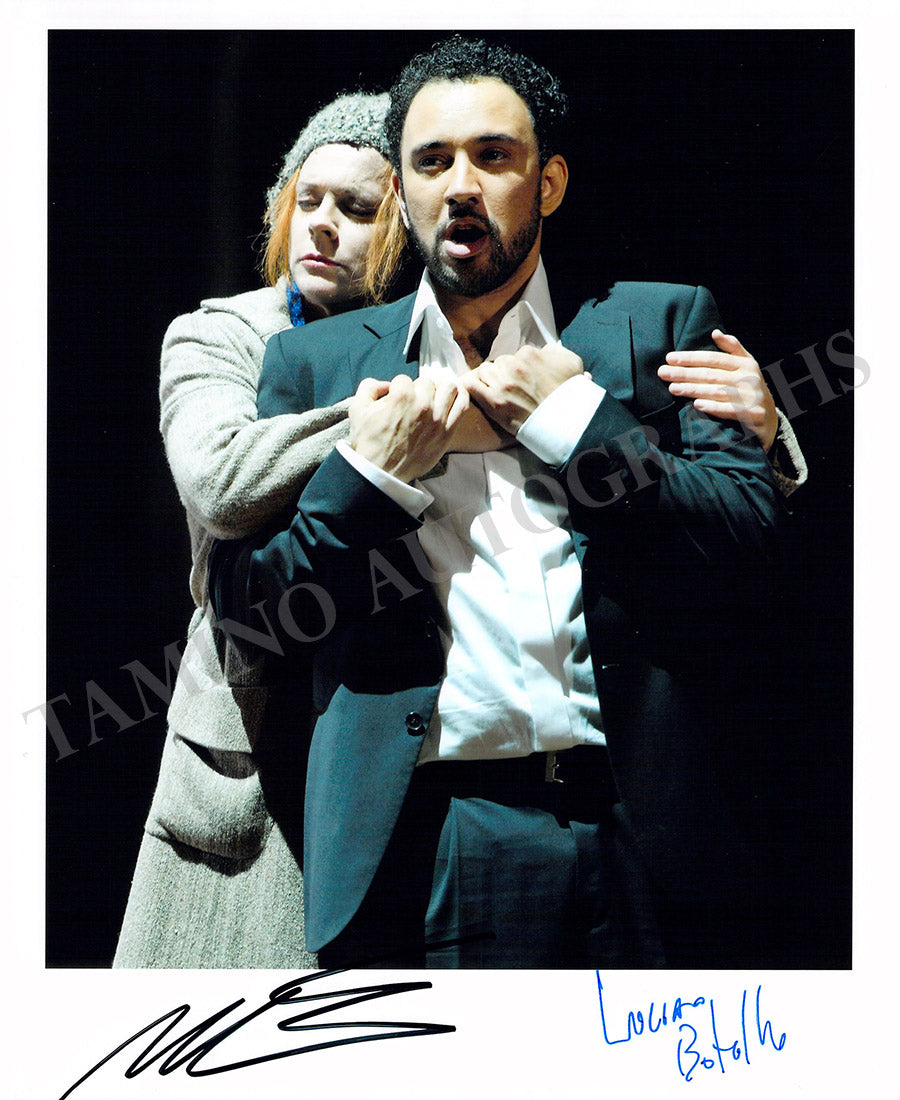 Fine color photograph signed by both artists, shown in Rossini's "La Donna del Lago". Size is 7.9 x 9.75 inches, in excellent condition.