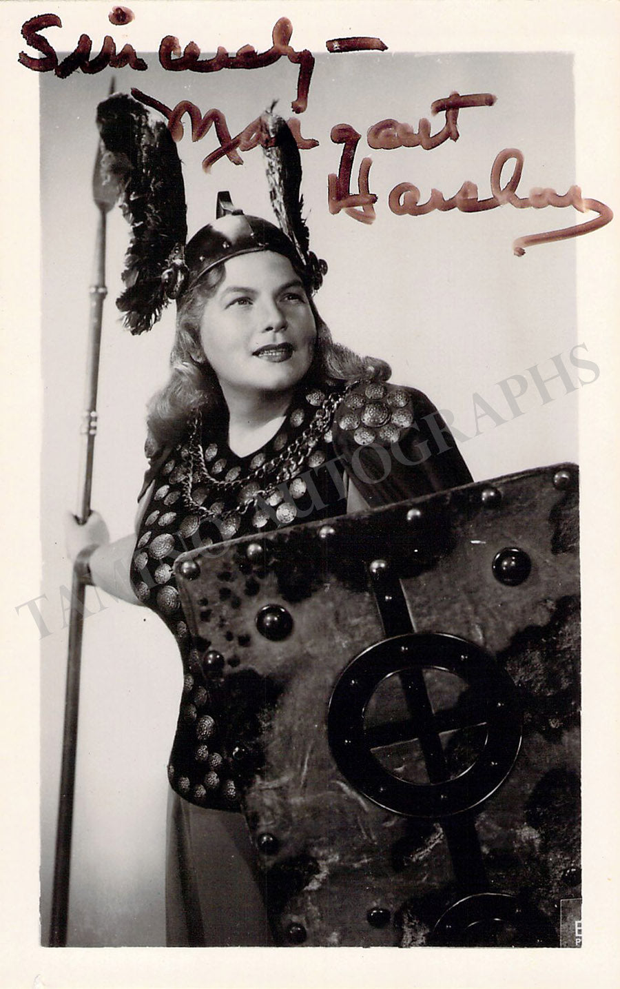 Fine black-and-white photo postcard signed by her, shown probably as Brunhilde in Wagner's "Die Walküre". Size is 3.5 x 5.5 inches, in excellent condition.