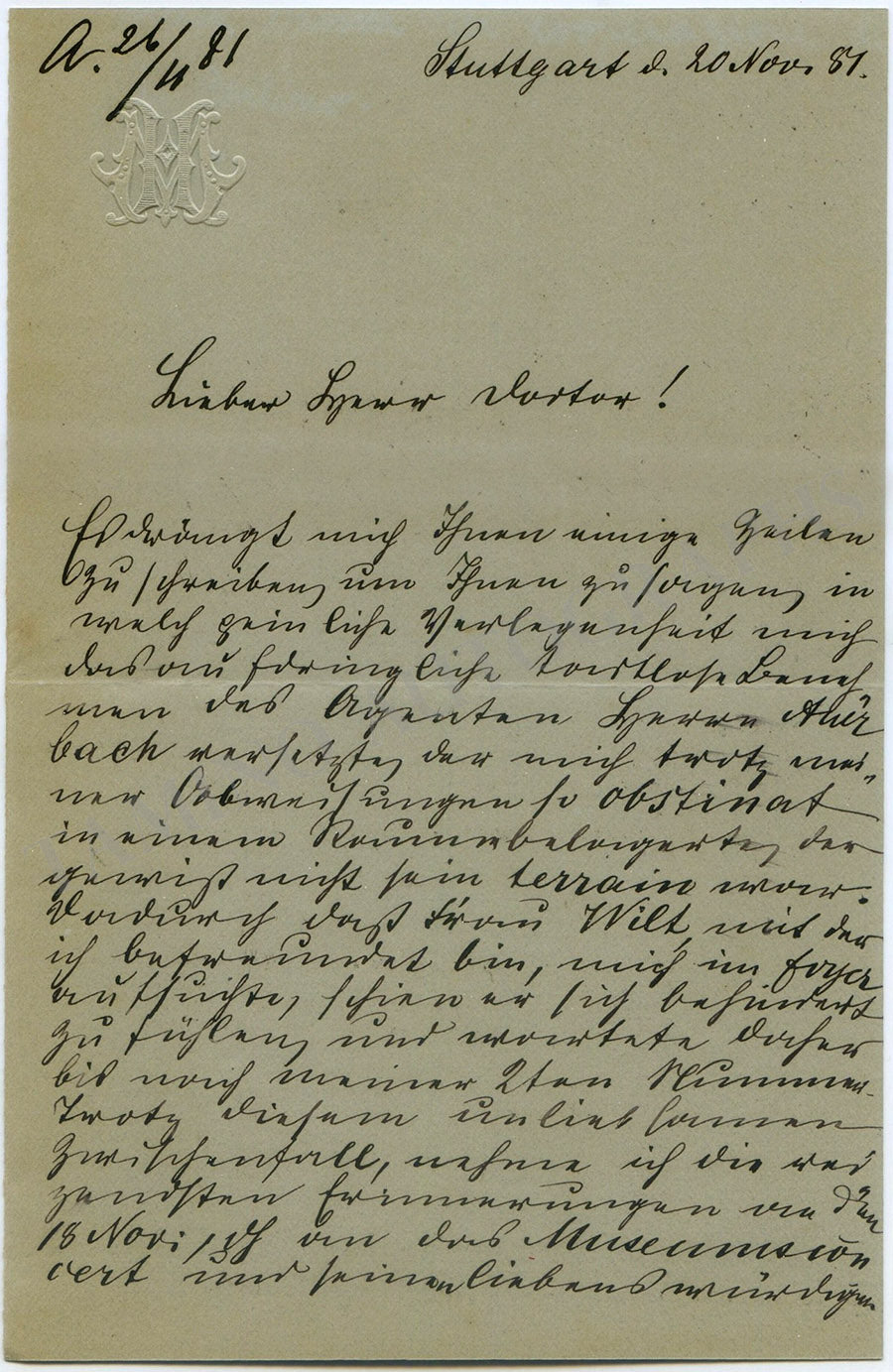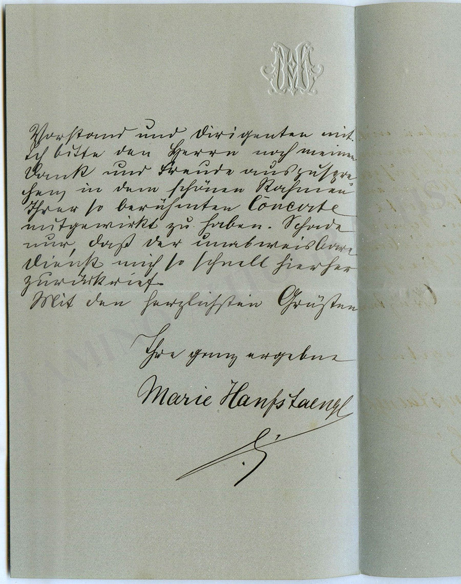 Autograph letter in German (untranslated) signed by her, dated Stuttgart, November 20, 1887, to a gentleman, concerning some musical evenings. Size is 4.7 x 7.2 inches, 2 written pages, embossed monogram, folds, overall age toning, in very good condition.