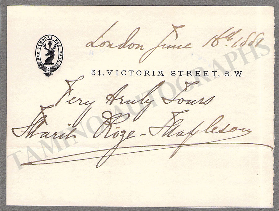 Fine card signed by her with a short sentiment dated in London, 1881. Size is 4.6 x 3.5 inches, in excellent condition.