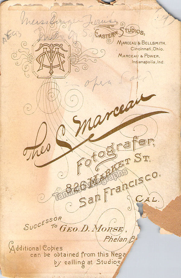 Austrian contralto (1856-?), signed cabinet photograph, shown as herself, dated in 1891. Photo by Theo Marceau photographers, San Francisco. Size is 4.25 x 6.5 inches, there are 2 noticeable cracks on top and bottom left sides, not affecting her image and signature, discount reflected in price.