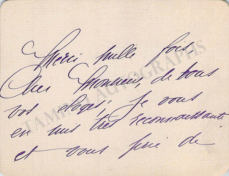 Autograph note in French signed by her on a card. Size is 4.5 x 3.5 inches, in excellent condition.