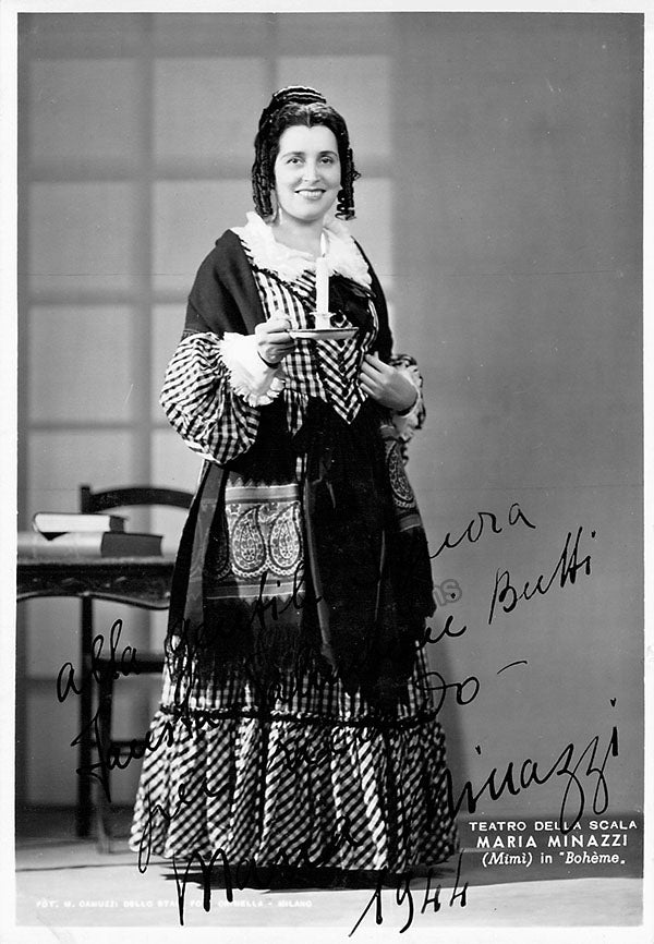 Italian soprano, active in the late 1930s and early 1940s, signed photograph, shown as Mimi in Puccini's La Boheme, inscribed with sentiment and dated in 1944. Photo by M. Camuzzi, Milan. Size is 4 x 5.75 inches, in excellent condition.