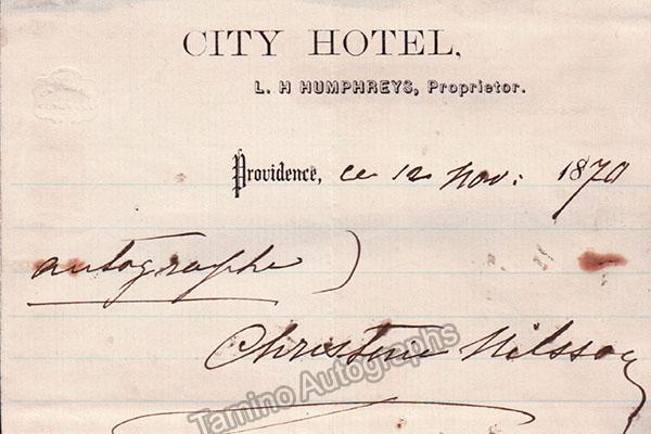 Star Swedish soprano (1843-1921), signed album page on letterhead of City Hotel in Providence, Rhode Island, dated in 1870, size is 3.25 x 5 inches. Also included: beautiful unsigned portrait, size 2.25 x 3.5 inches. Both in excellent condition.