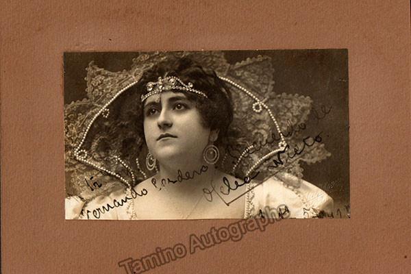 Spanish soprano (1898-1931) who died very young at the top of her career. Signed photo, shown in role, inscribed. Photo size is 5 x 3 inches, mounted on a hard cardboard that is 7.25 x 5.25 inches.