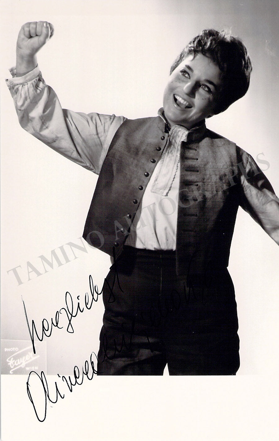 Black-and-white photograph signed by her, shown as Papagena in Mozart's Die Zauberflote; blind-stamped on front and stamped on verso by photographer Fayer (Vienna). Size is 3.5 x 5.5 inches, in excellent condition.