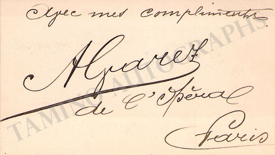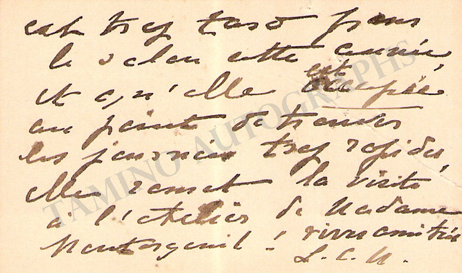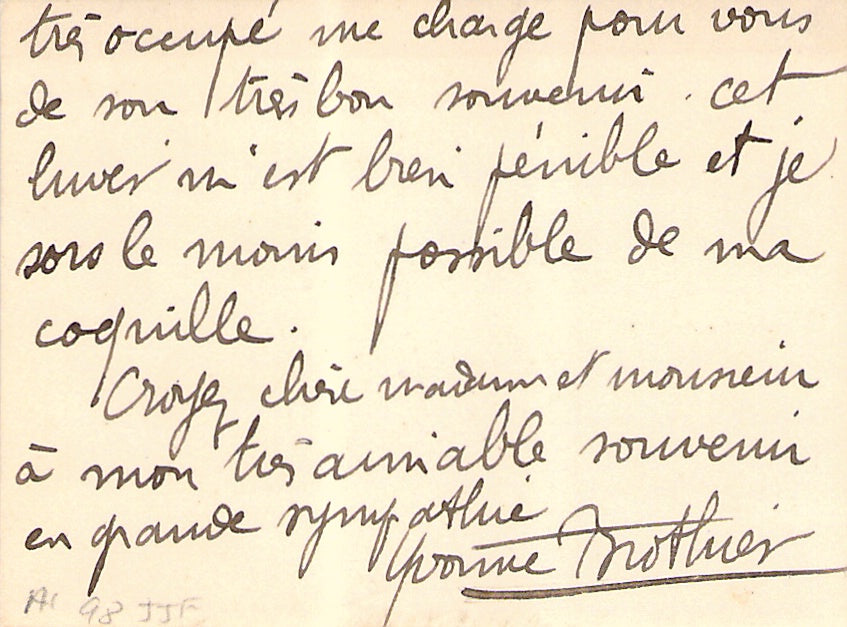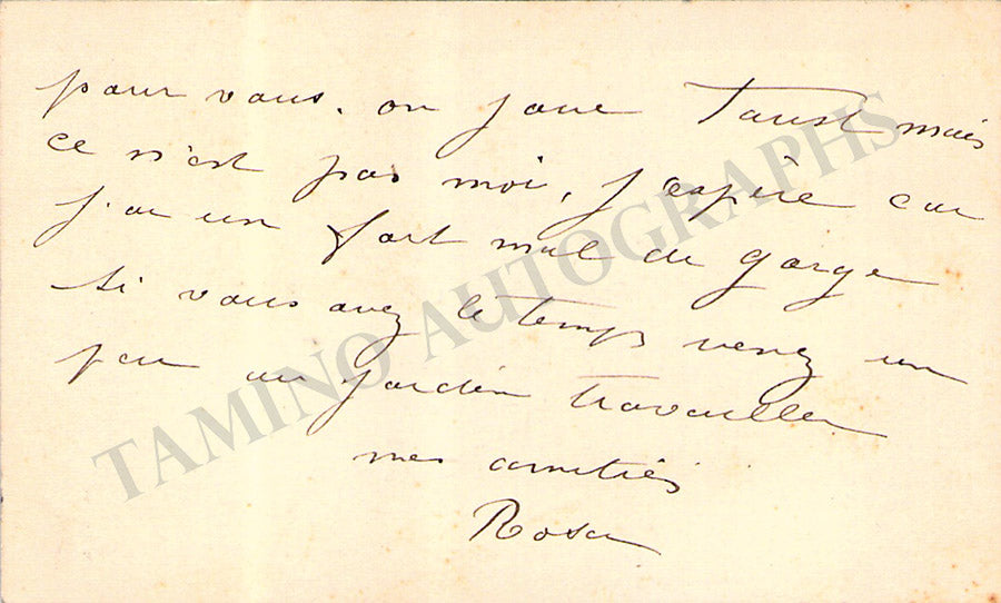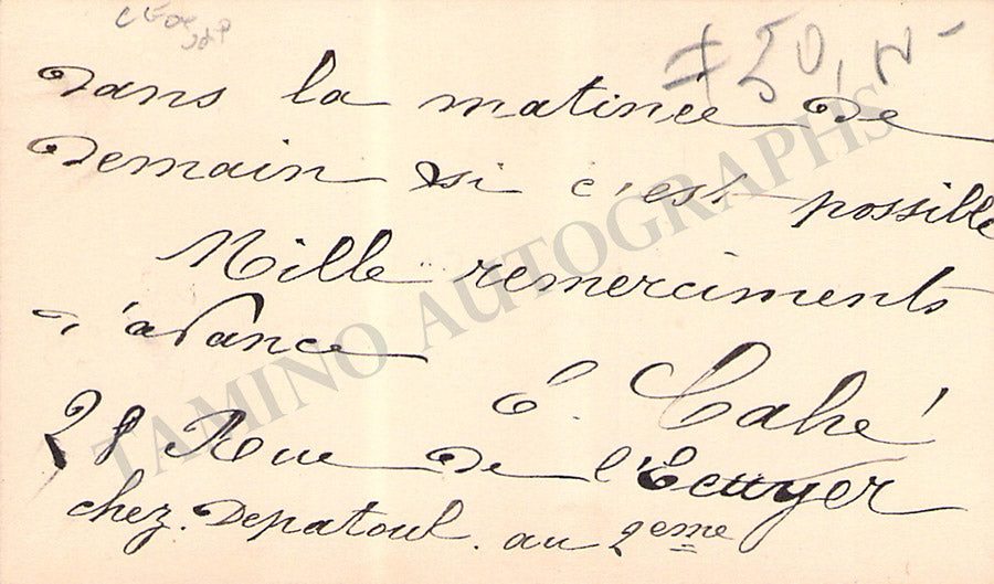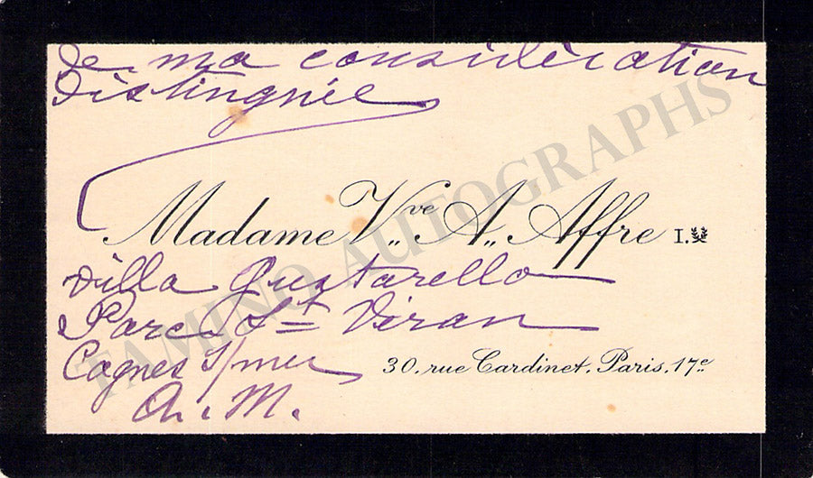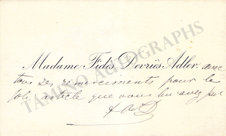His business card with a short sentiment in French written by him. Size is 3.75 x 2.25 inches, overall soft age-toning, in excellent condition.