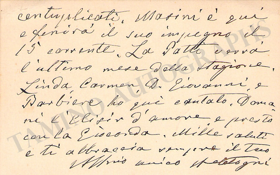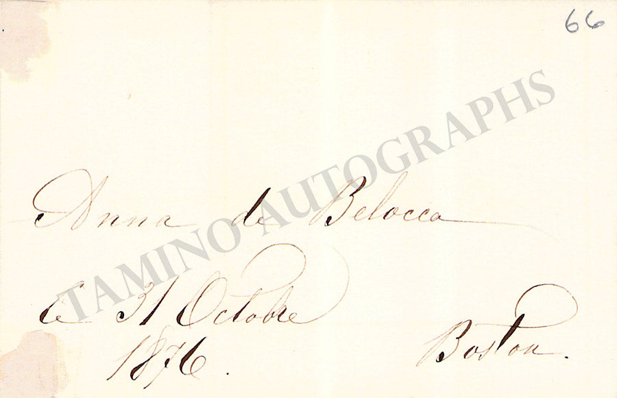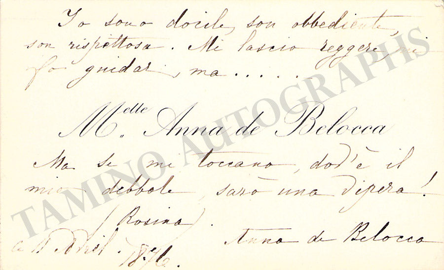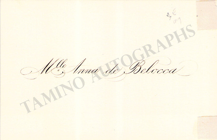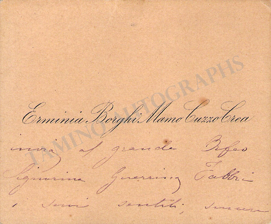 Her business card with a short sentiment in Italian written by her, dated 1898. Size is 3.4 x 2.75 inches, tape residues over the top, otherwise in very good condition.