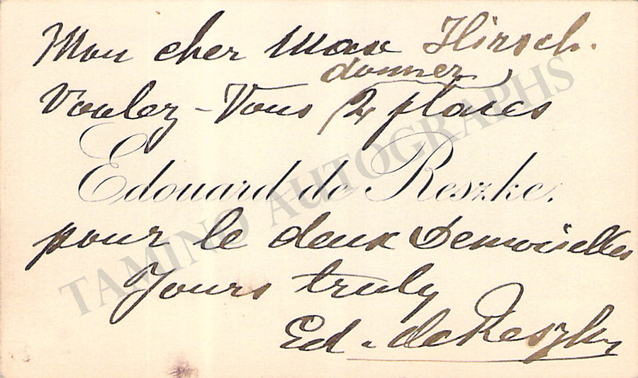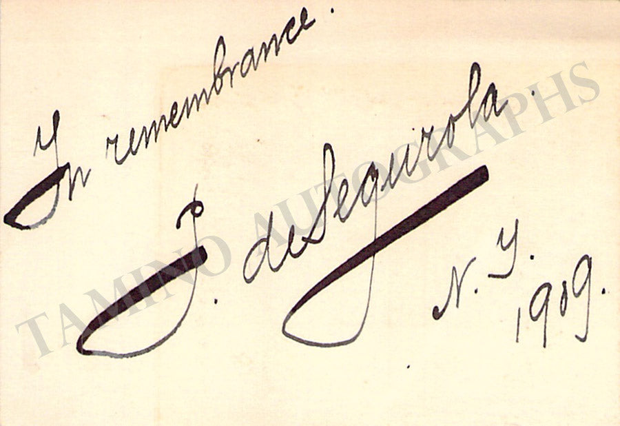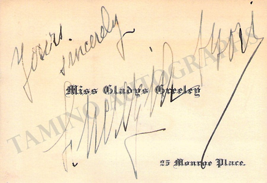 Business card from music fan Gladys Greeley signed by De Segurola on the back with a short sentiment dated in New York, 1909. Size is 2.8 x 2 inches, in excellent condition.