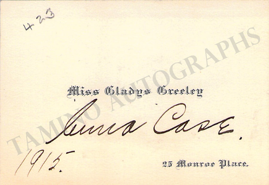 Business card from music fan Gladys Greeley signed by Case on the back in 1915. Size is 2.8 x 2 inches, in excellent condition.