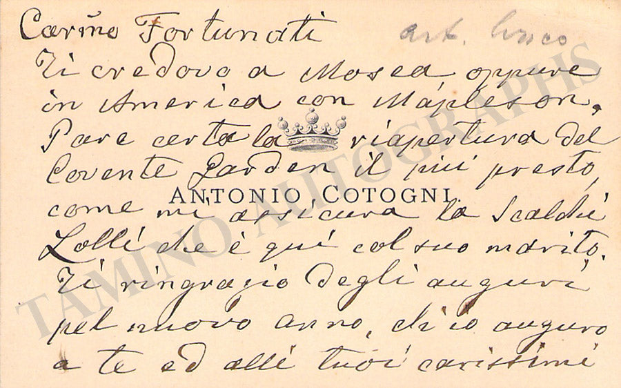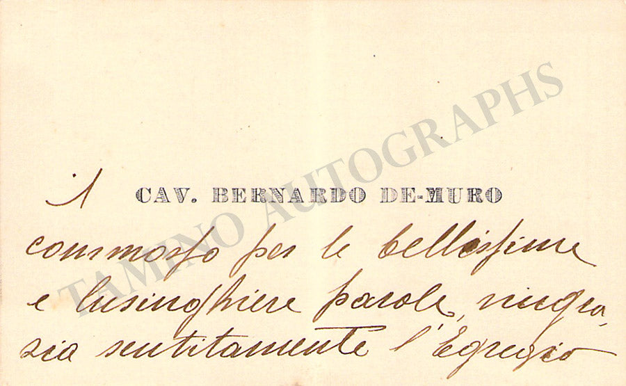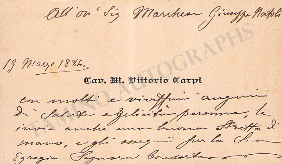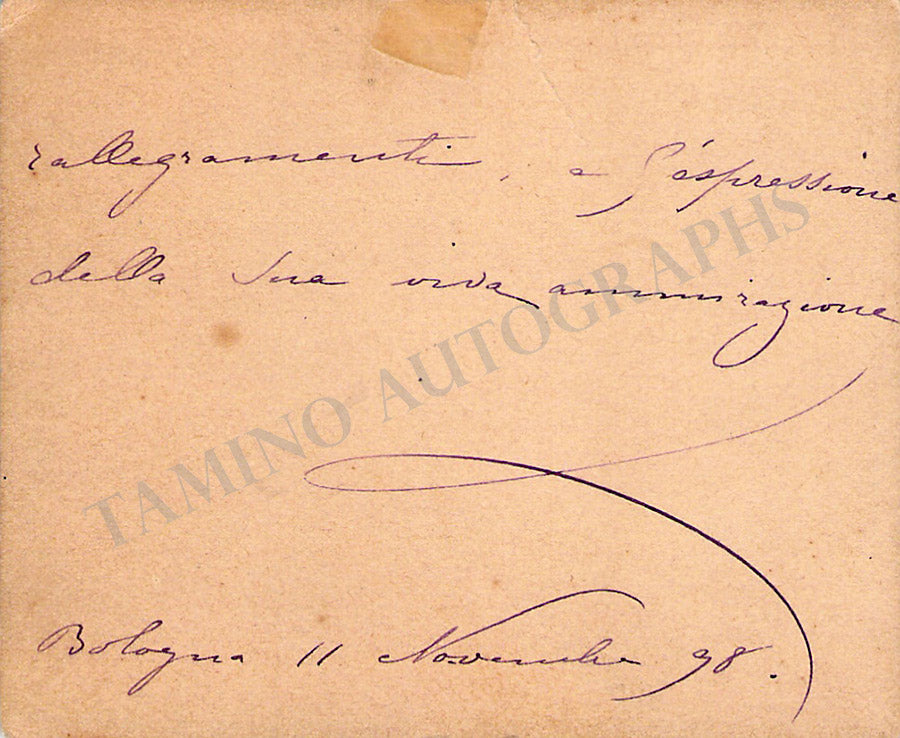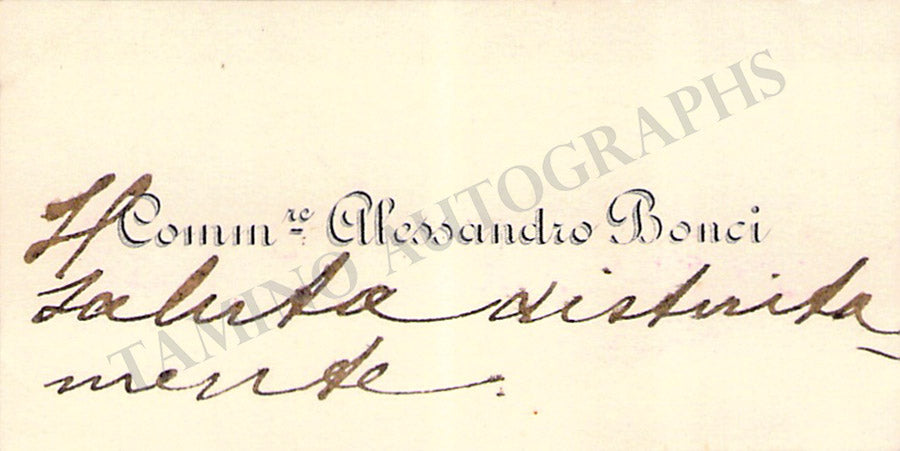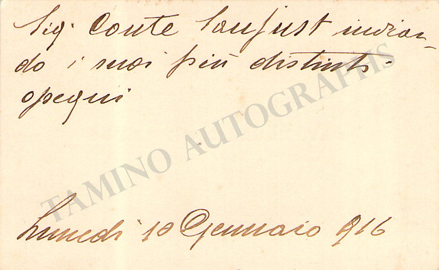 His business card with a short sentiment in Italian written by him. Size is 2.75 x 1.5 inches, overall light age-toning, in excellent condition.