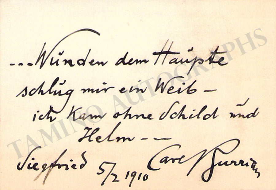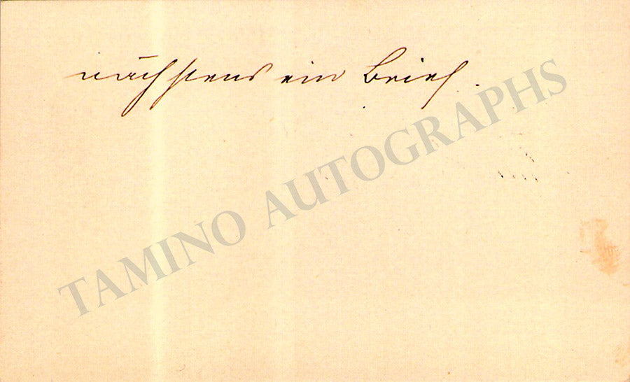 His business card with a short sentiment in German written by him. Size is 4 x 2.25 inches, overall soft age-toning, dirt stains, creases, otherwise in very good condition.