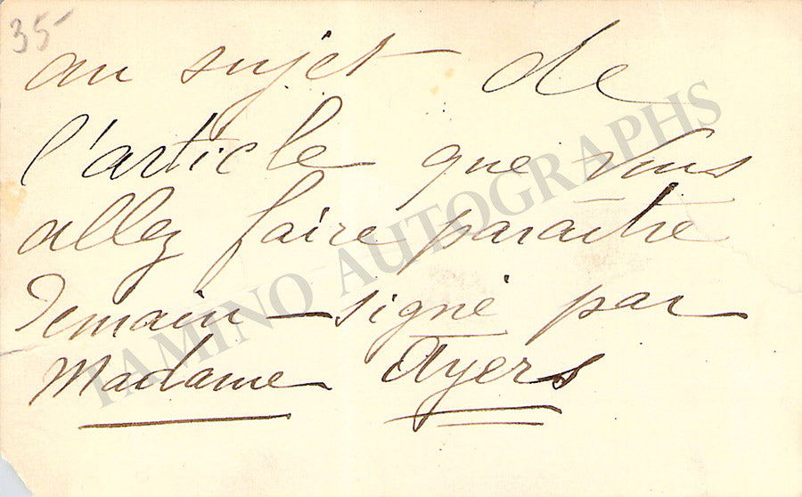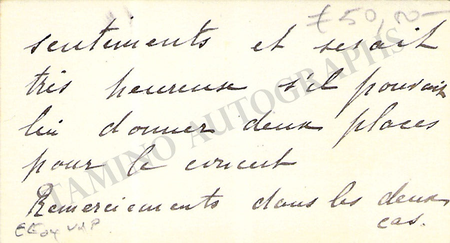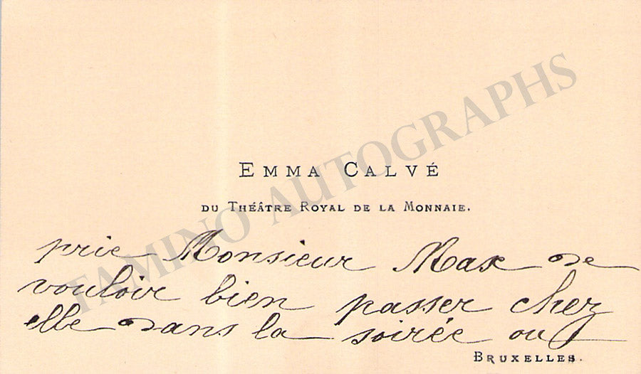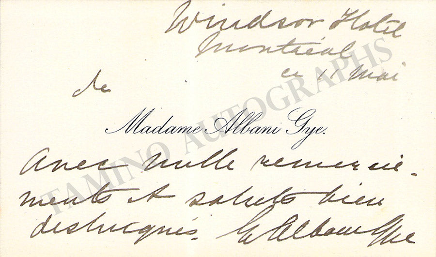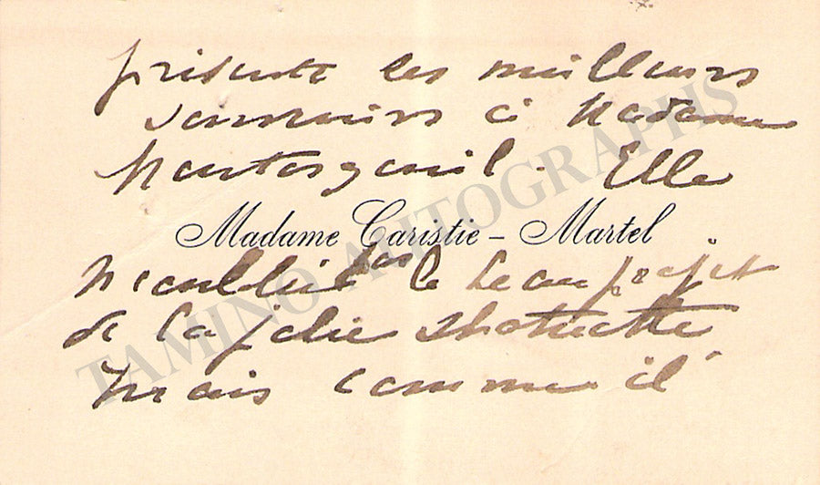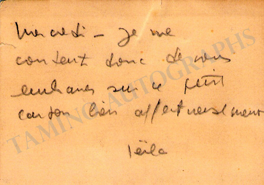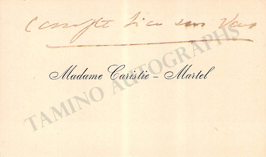 Her business card with a long message in French signed by her on the verso. Size is 4 x 2.4 inches, overall light age-toning, in very good condition.