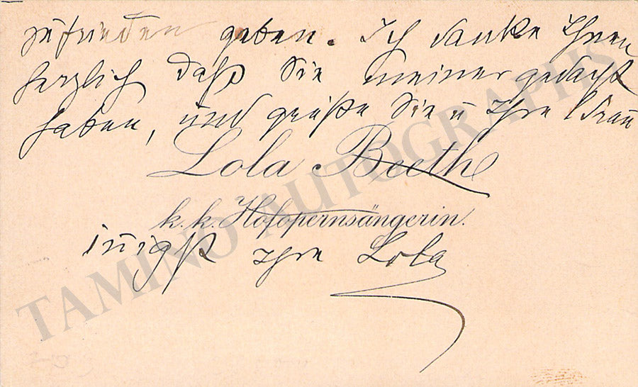 Her original printed business card signed as 'Lola' with a short message in German. Size is 4 x 2.4 inches, in excellent condition.