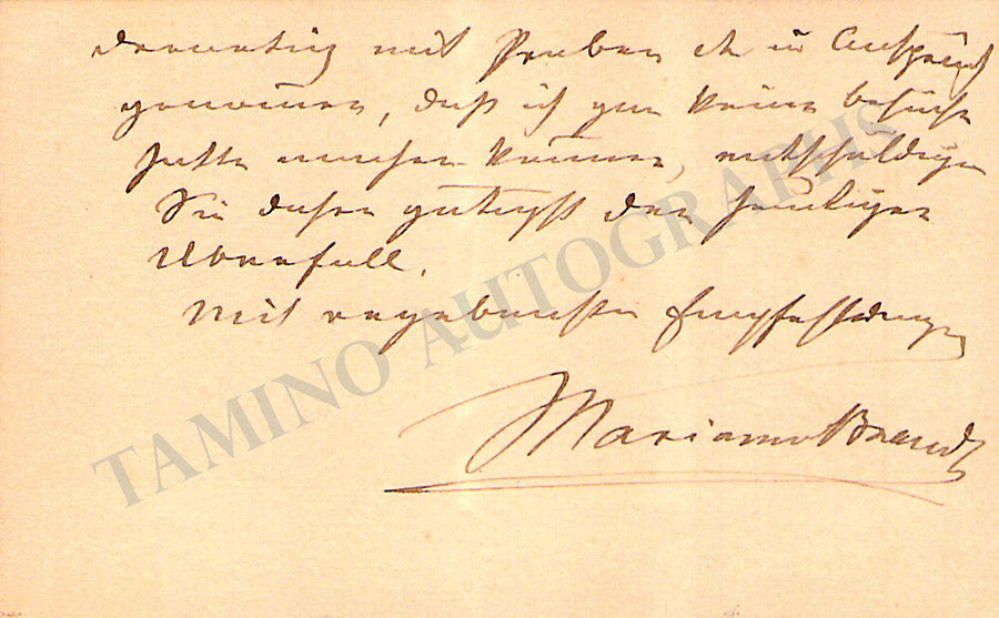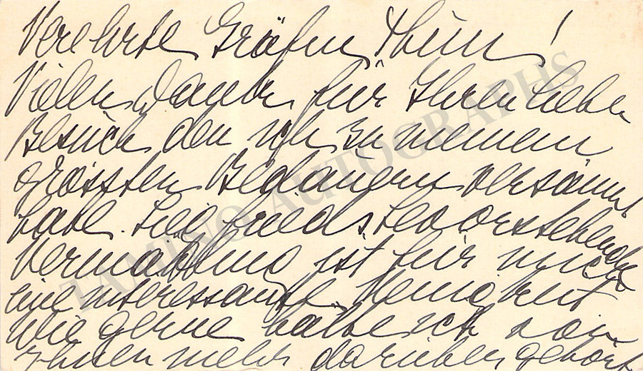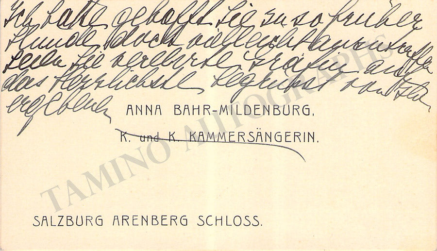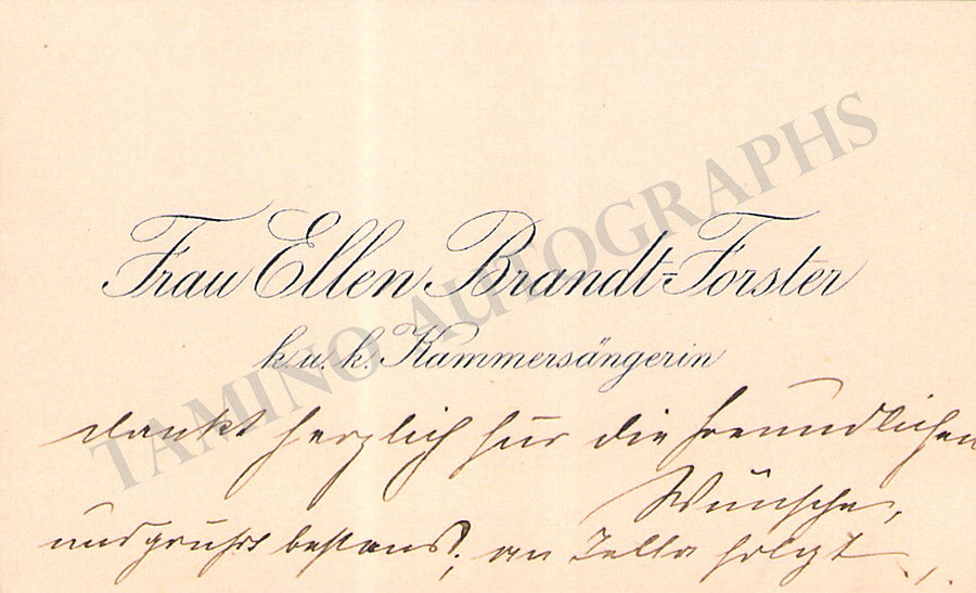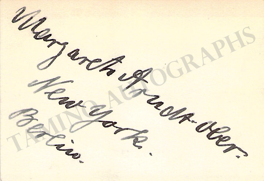 Her business card with a short sentiment written by her in German. Size is 3.6 x 2.25 inches, overall light age-toning, in very good condition.