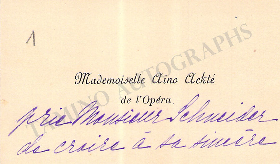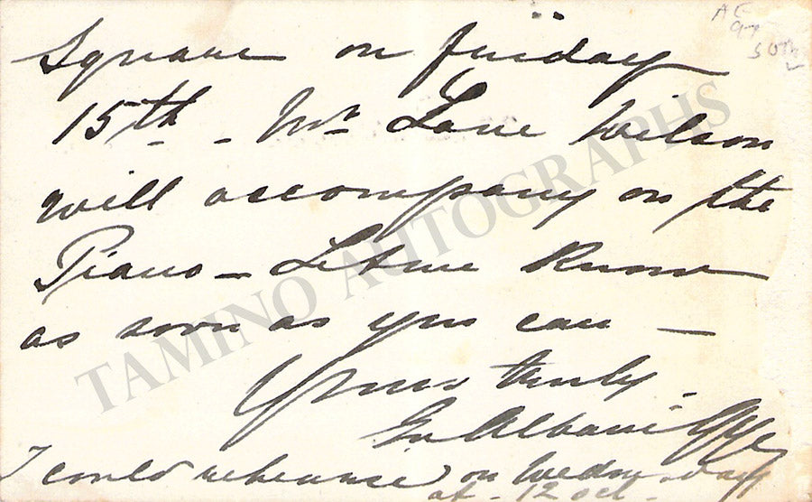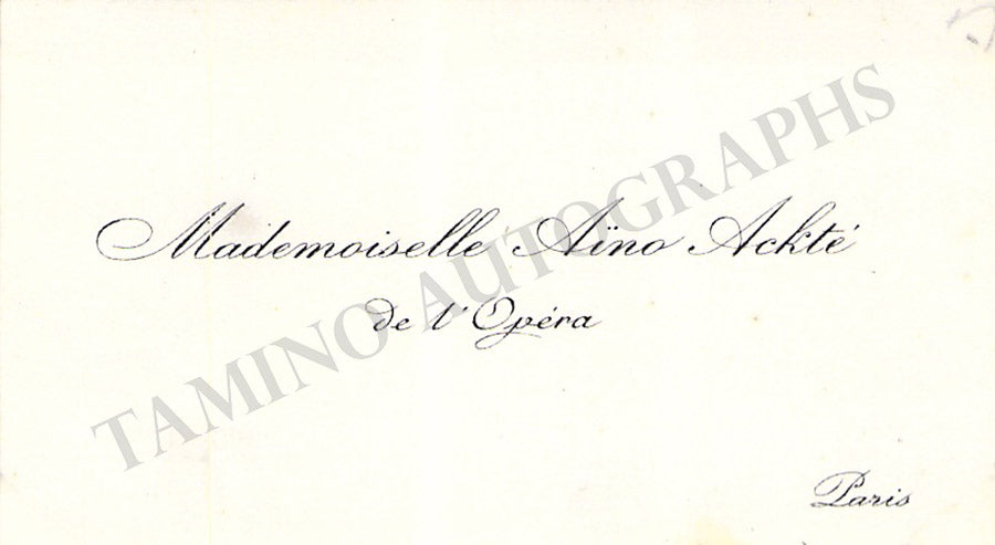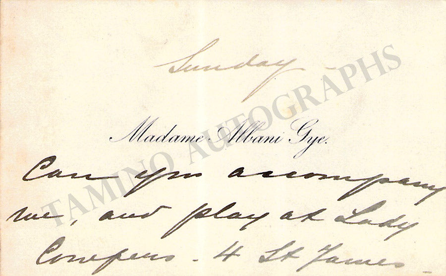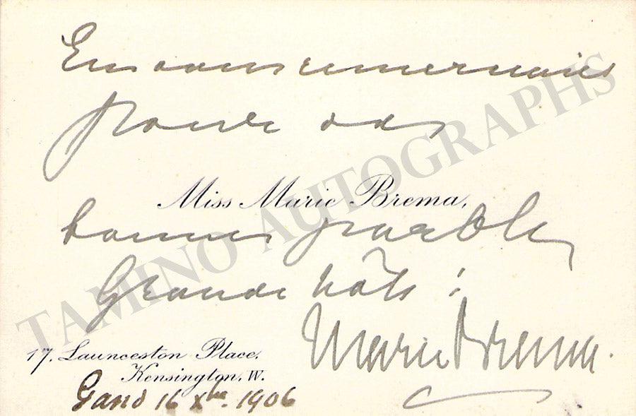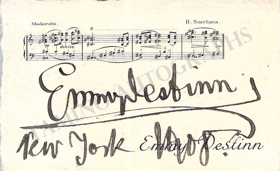 Her business card with a printed music quote from Smetana boldly signed by her dated 1908. Size is 4 x 2.5 inches, irregular borders, overall soft age-toning, mounting traces on verso, otherwise in excellent condition.