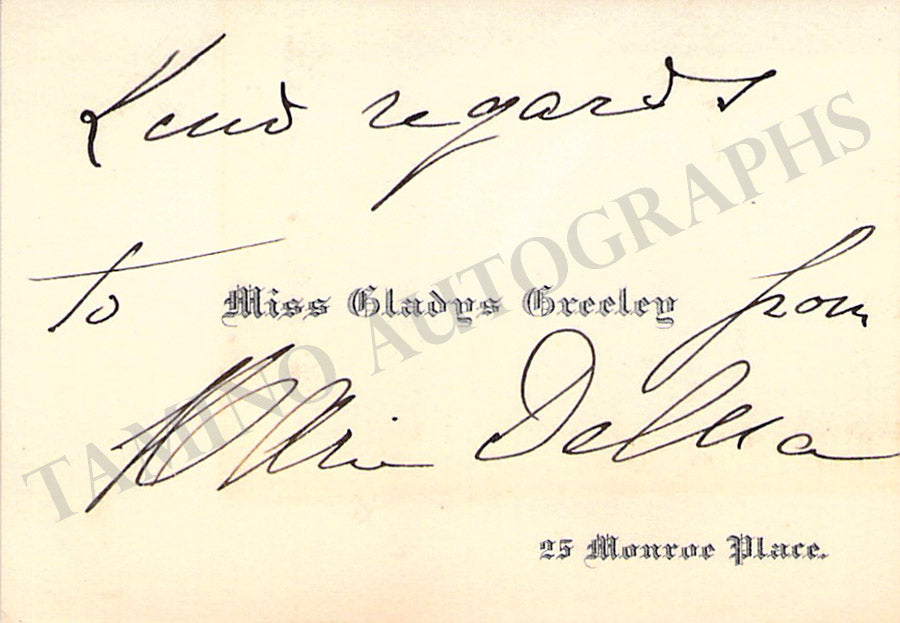 Business card from music fan Gladys Greeley signed by Delna on the front with a short sentiment. Size is 2.8 x 2 inches, in excellent condition.