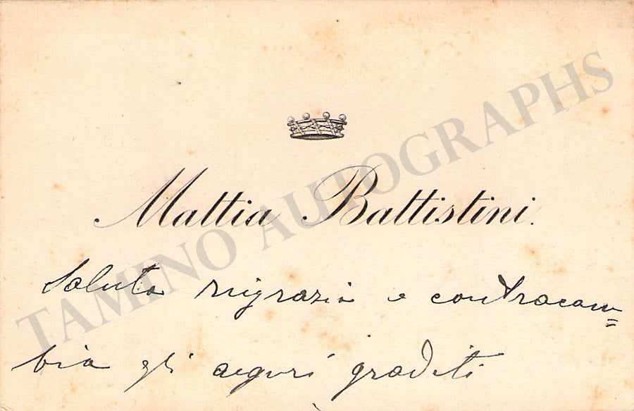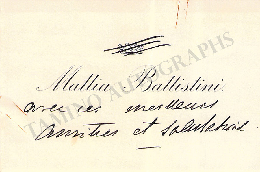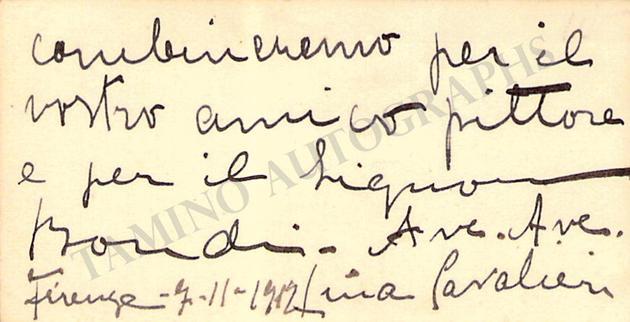 Her business card with a short sentiment in Italian written by her. Size is 3.75 x 2 inches, overall light age-toning, mounting traces on verso.