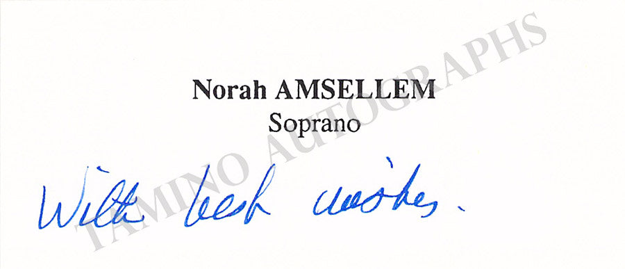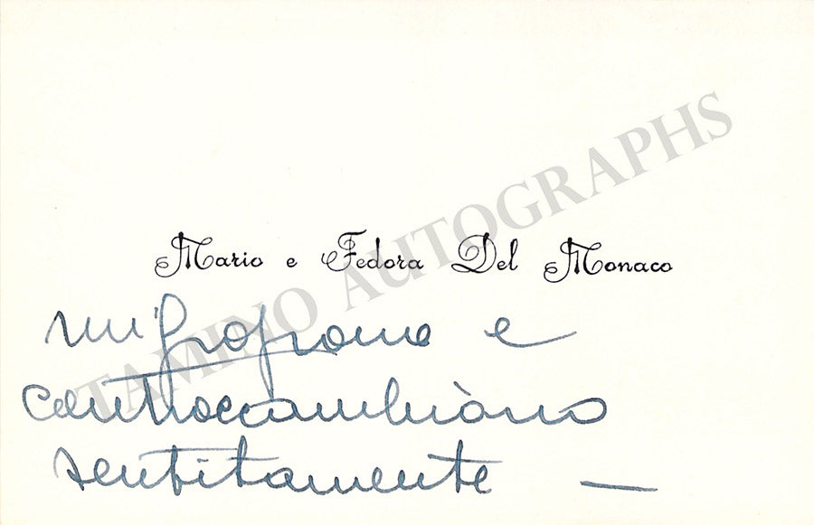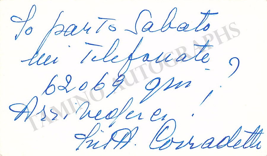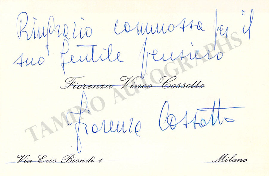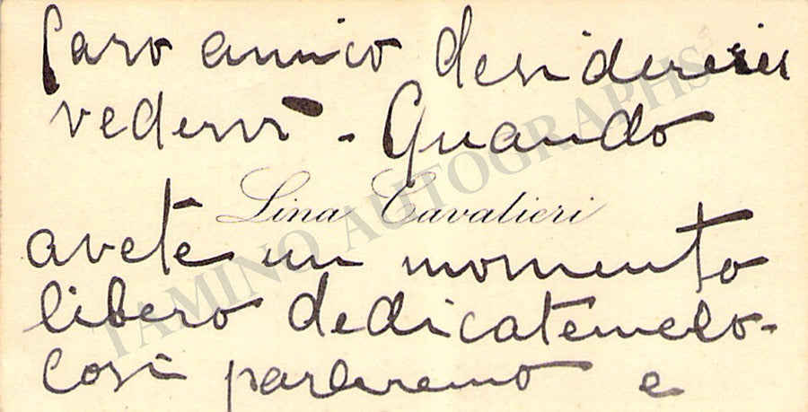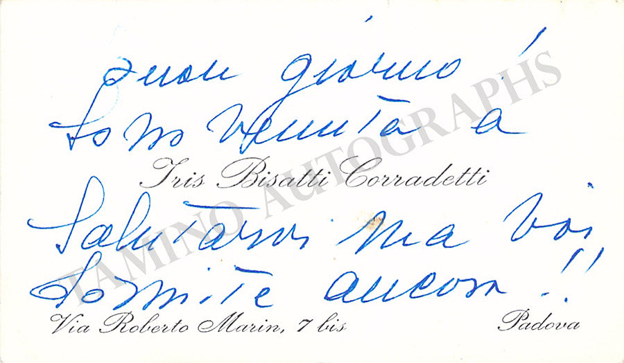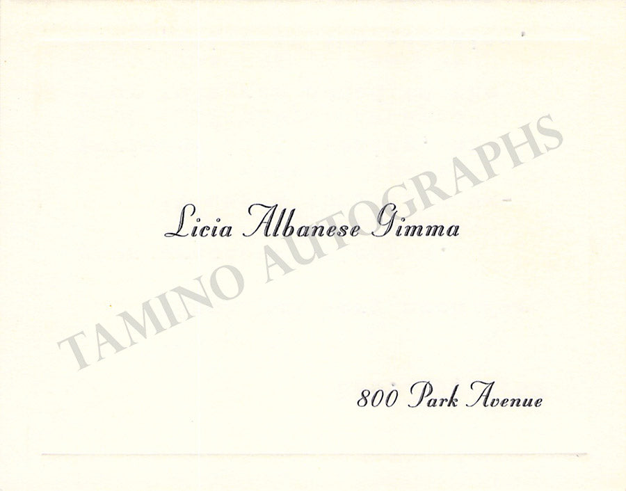 Her business card signed by her on verso with a short message in Italian. Size is 3.75 x 2.25 inches, in very good condition.