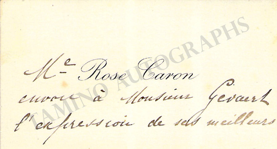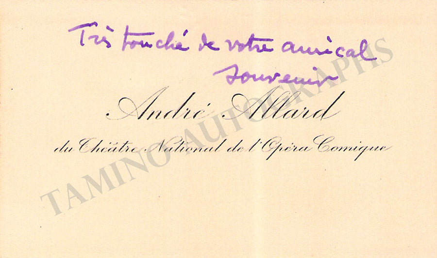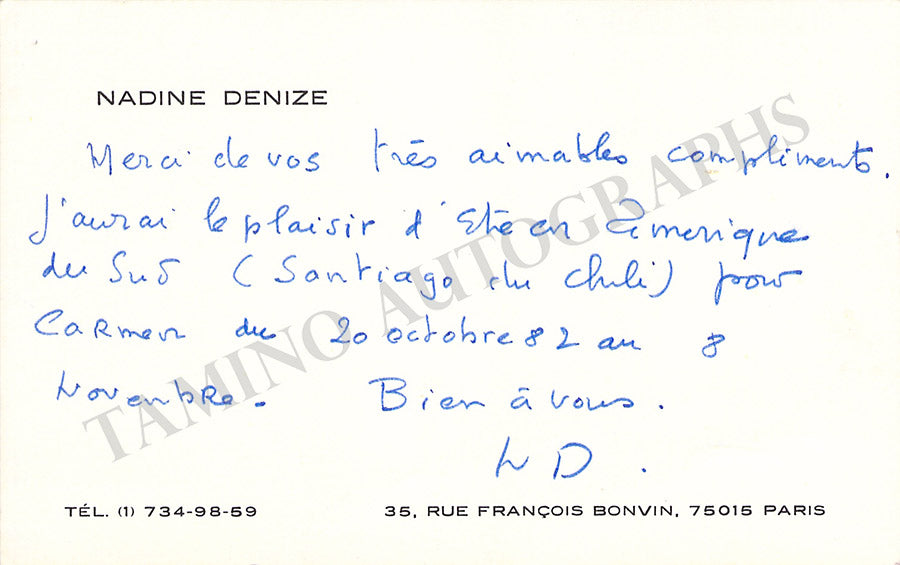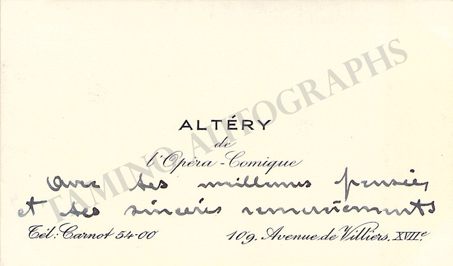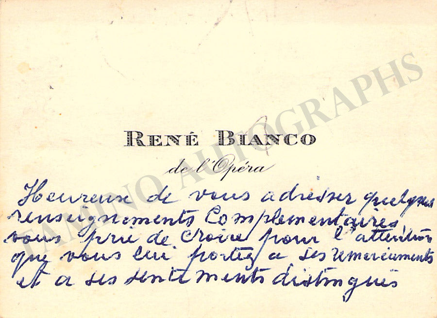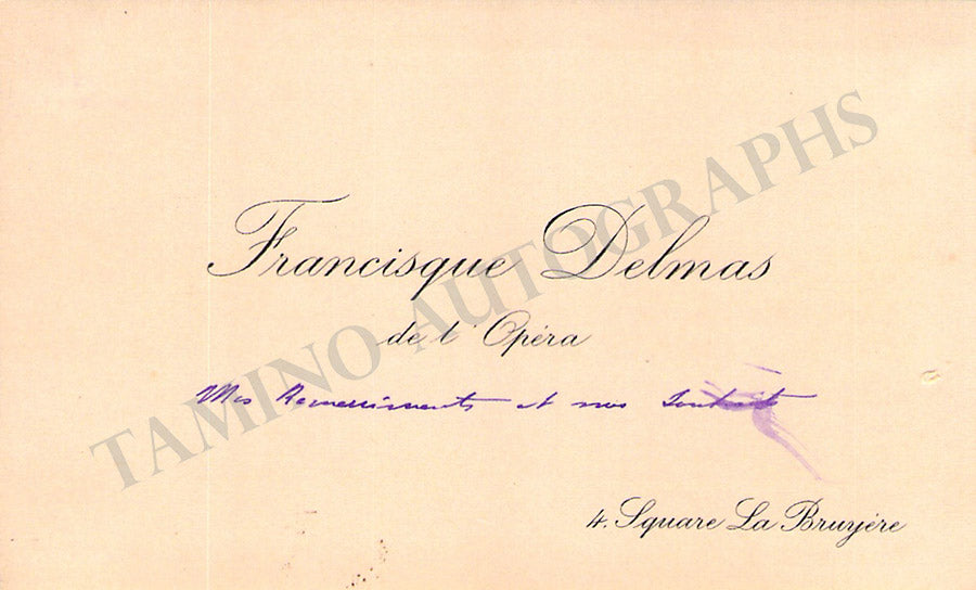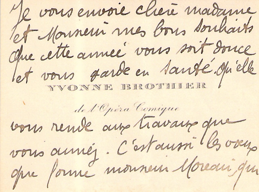 Her business card signed by her with a short sentiment in French. Size is 3.75 x 2.25 inches, dirt stains, in overall excellent condition.