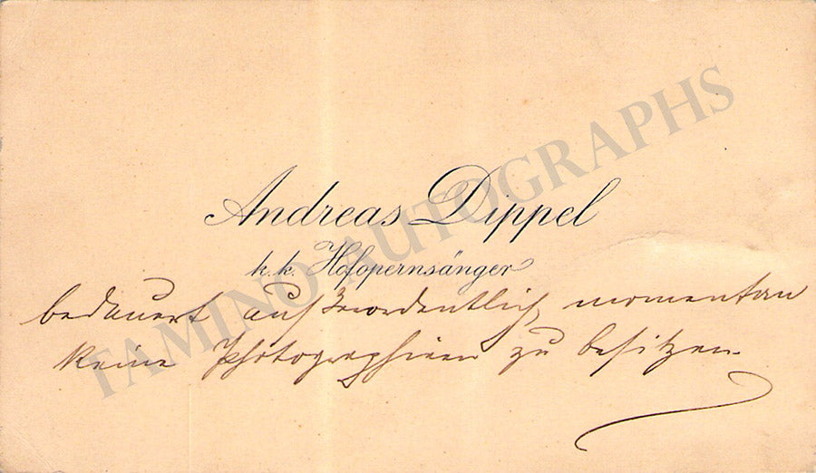 Business card from music fan Gladys Greeley signed by Burrian on the back with a text quote from Siegfried and dated 1910. Size is 2.8 x 2 inches, in excellent condition.