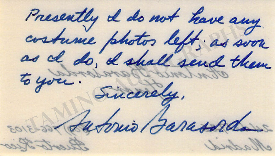 Business card from music fan Gladys Greeley signed by Bori on the front with a short sentiment. Size is 2.8 x 2 inches, in excellent condition.