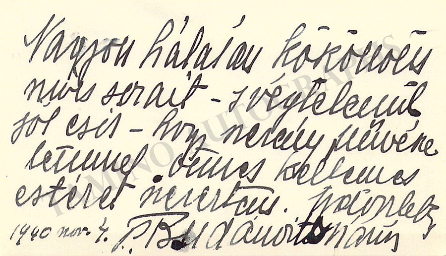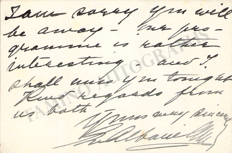 His business card signed by him on the front with a message written by him. Size is 3.7 x 2.2 inches, some stains over the bottom, mounting traces on verso, overall soft age-toning, in very good condition.