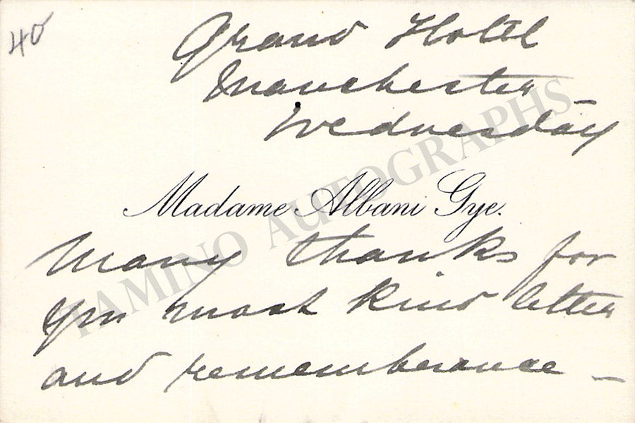 Fine card signed by her in 1902. Size is 4.3 x 3.5 inches, in excellent condition.