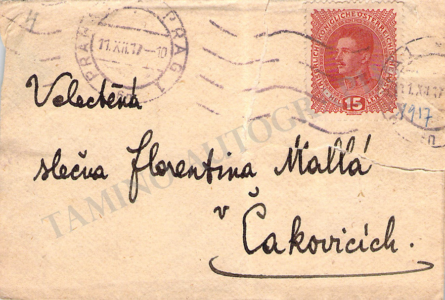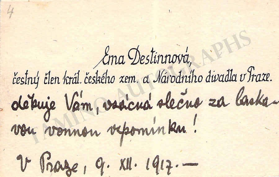 Her business card with printed text in Czech and a message in Czech handwritten by her, dated 1917. Size is 4 x 2.5 inches, overall soft age-toning, in excellent condition.