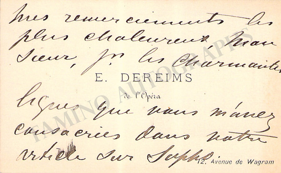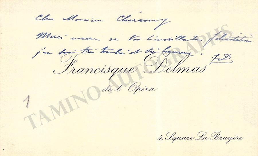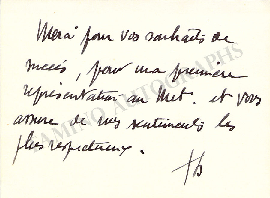 Business card from music fan Gladys Greeley signed by Dufranne on the front with a short sentiment with a short sentiment in French dated 1908. Size is 2.8 x 2 inches, in excellent condition.
