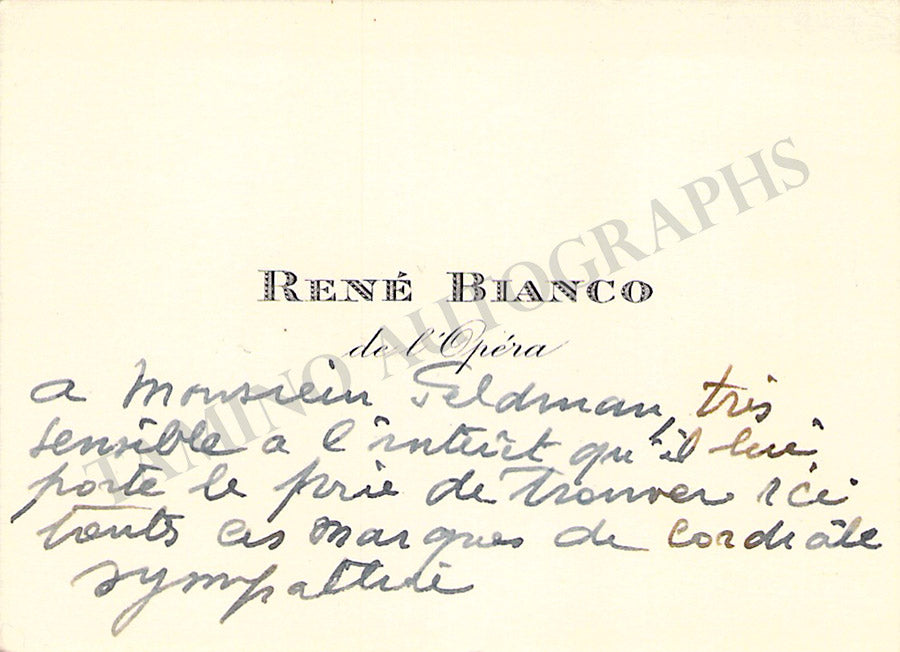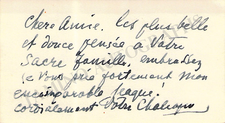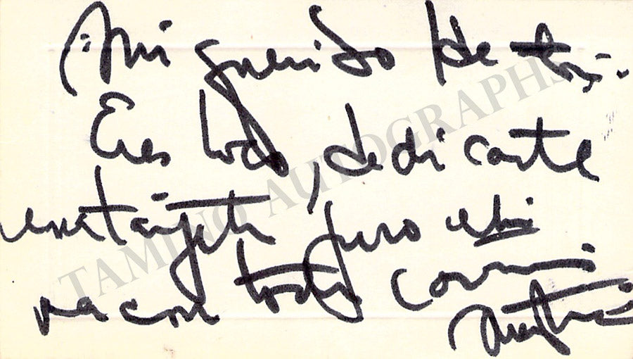 His business card with a short message written by him in French. Size is 3.3 x 2.5 inches, in very good condition.
