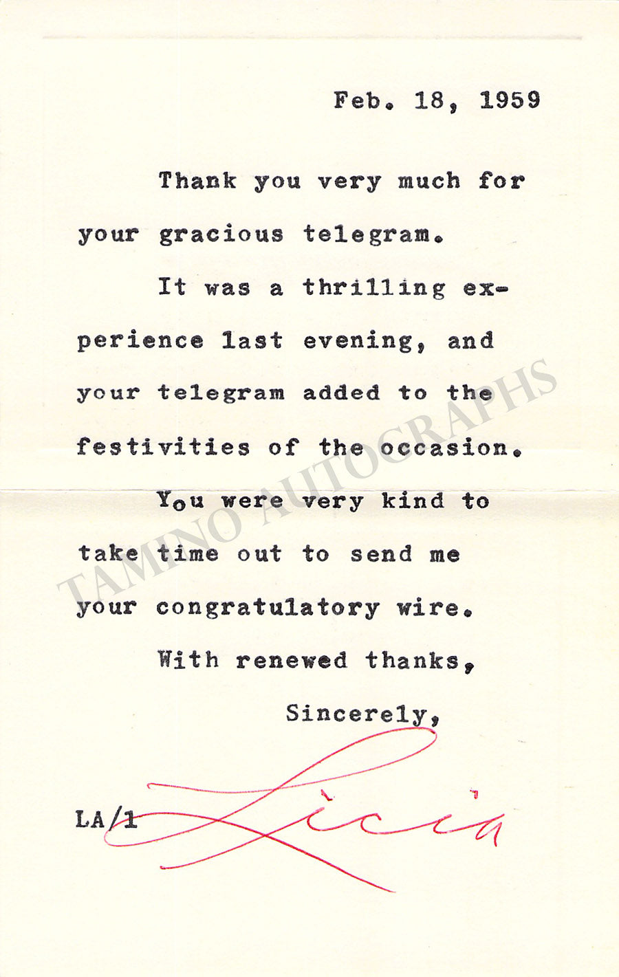 Her business card with a long typed sentiment signed by her, dated 1958. Open size is 6.1 x 3.9 inches, in excellent condition.