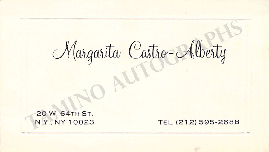 Her printed business card with a short note written by her, dated in Brussels Nov 29, 1962. Size is 3.75 x 2.4 inches, in excellent condition.